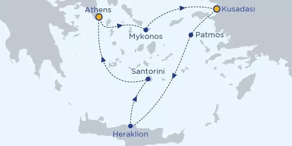 Our magical Iconic Aegean cruise delivers a packed schedule and takes you to no fewer than six enchanting destinations in the romantic Aegean Sea. Embark on a fascinating journey as you glide through emerald waters to unravel the mystery of history, take in breathtaking landscapes and discover iconic landmarks. This remarkable voyage invites you to experience the Mediterranean lifestyle, sample authentic Greek cuisine and visit iconic locations.
